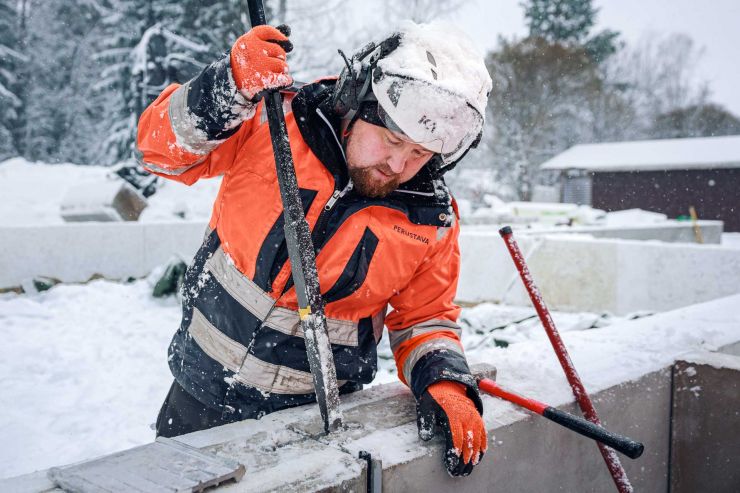 "Tänne on tehty Perustavan uudella elementtisokkelilla omakotitalon ja autotallin perustukset. Suunnilleen yhdeksän aikaan tuli elementit meille tänne työmaalle. Lunta satanut jonkun verran, mutta silti ollaan nyt jo valmiita", kertoo Jaakko-Pekka Kumpula.